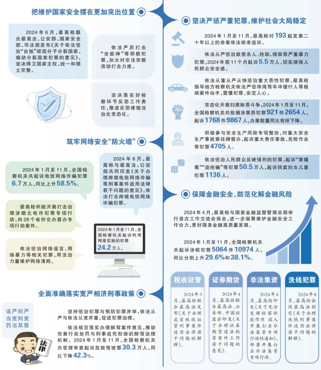 国家安全是中国式现代化行稳致远的重要基础。维护社会大局稳定是检察机关的基本职责。2024年,全国检察机关深入贯彻落实习近平法治思想和总体国家安全观,更加全面、准确落实宽严相济刑事政策,完善刑事指控体系,切实把防风险、保安全、护稳定融入日常履职,全力维护国家安全、社会安定、人民安宁,以高水平安全保障高质量发展。