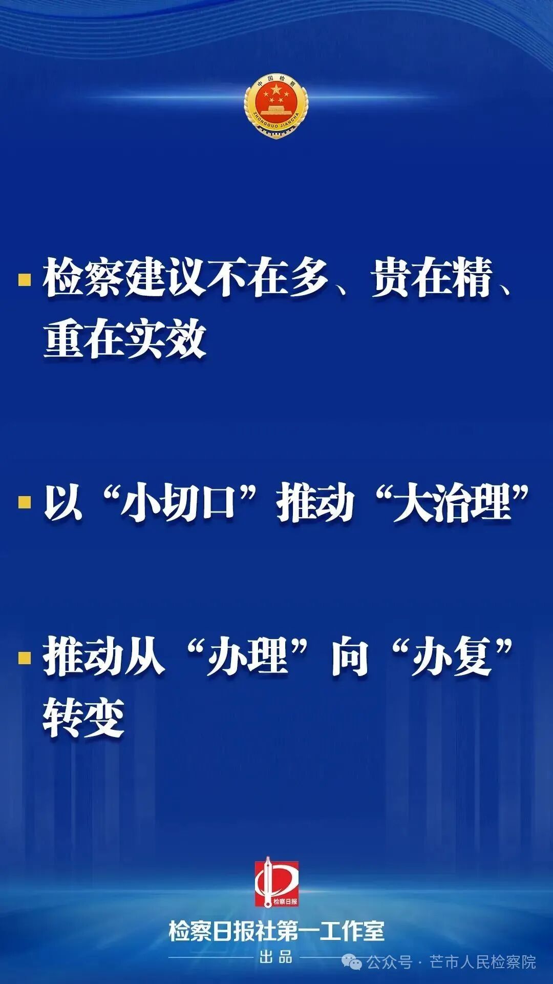 “检察建议不在多、贵在精、重在实效,要重视、加强、规范,推动取得更好效果。”会议指出,检察建议是检察机关加强法律监督、参与社会治理的重要方式。近年来,检察机关依法制发社会治理检察建议,与相关行政机关形成合力,共同助推社会治理现代化,取得良好成效。面对新形势新任务,社会治理检察建议工作还不同程度存在质效不够高、跟踪督促不够等问题。要结合履职办案,着力提升社会治理检察建议的精准性规范性,以“小切口”推动“大治理”,推动从“办理”向“办复”转变,持续跟进督促落实,做好“后半篇文章”,助力健全社会治理体系,提升社会治理法治化水平。