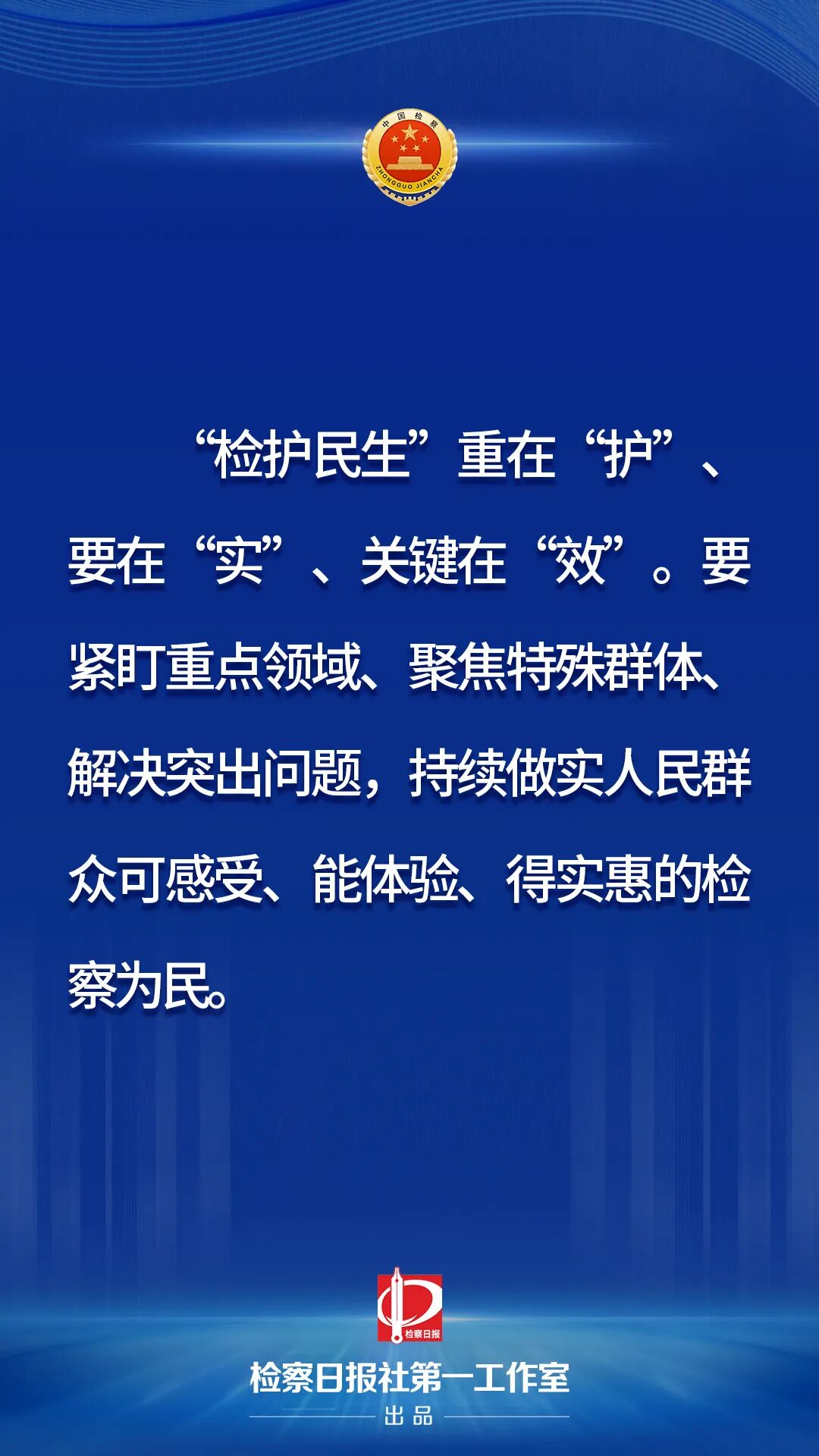 “检护民生”重在“护”、要在“实”、关键在“效”。要紧盯食药、社保、医疗、消费等重点领域,聚焦妇女儿童、残疾人、老年人、劳动者等特殊群体,解决严重影响群众安全感的犯罪、虚假诉讼、不当终结本次执行、网络生态治理、矛盾纠纷实质性化解等方面突出问题,把事关人民群众合法权益的案件一件件办好,把事关人民群众切身利益的难点堵点问题一项项解决好,持续做实人民群众可感受、能体验、得实惠的检察为民。