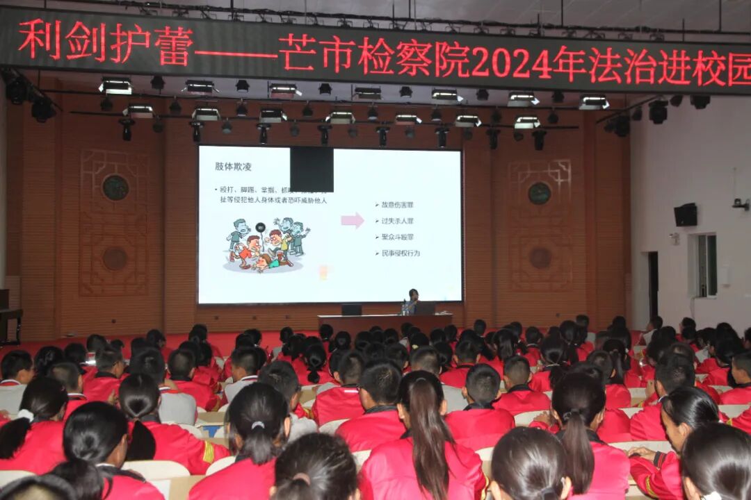 4月17日晚,芒市人民检察院联合芒市公安局城南派出所、芒市勐焕街道司法所到德宏州民族初级中学开展法治讲座。未检干警重点讲解了校园欺凌的类型与危害,邀请同学上台表演展示肢体欺凌后果的严重性,同时通过与台下同学的趣味互动,引导同学们思考校园欺凌的应对措施。讲座现场氛围热烈,同学们积极配合、认真聆听。