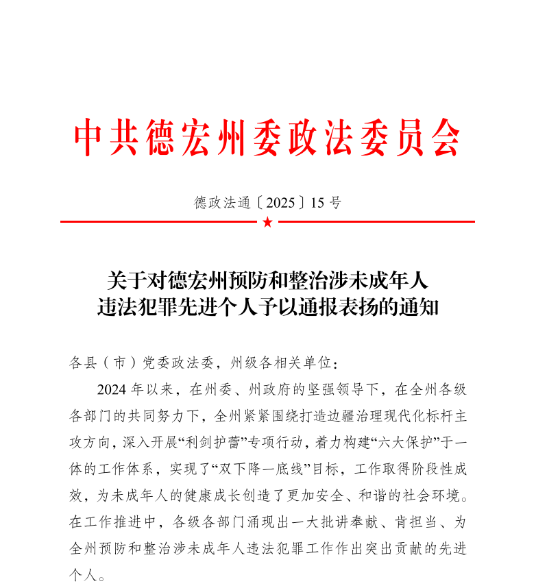 日前,中共德宏州委政法委员会印发《关于对德宏州预防和整治涉未成年人违法犯罪先进个人予以通报表扬的通知》,芒市人民检察院周子茜同志受到通报表扬。
