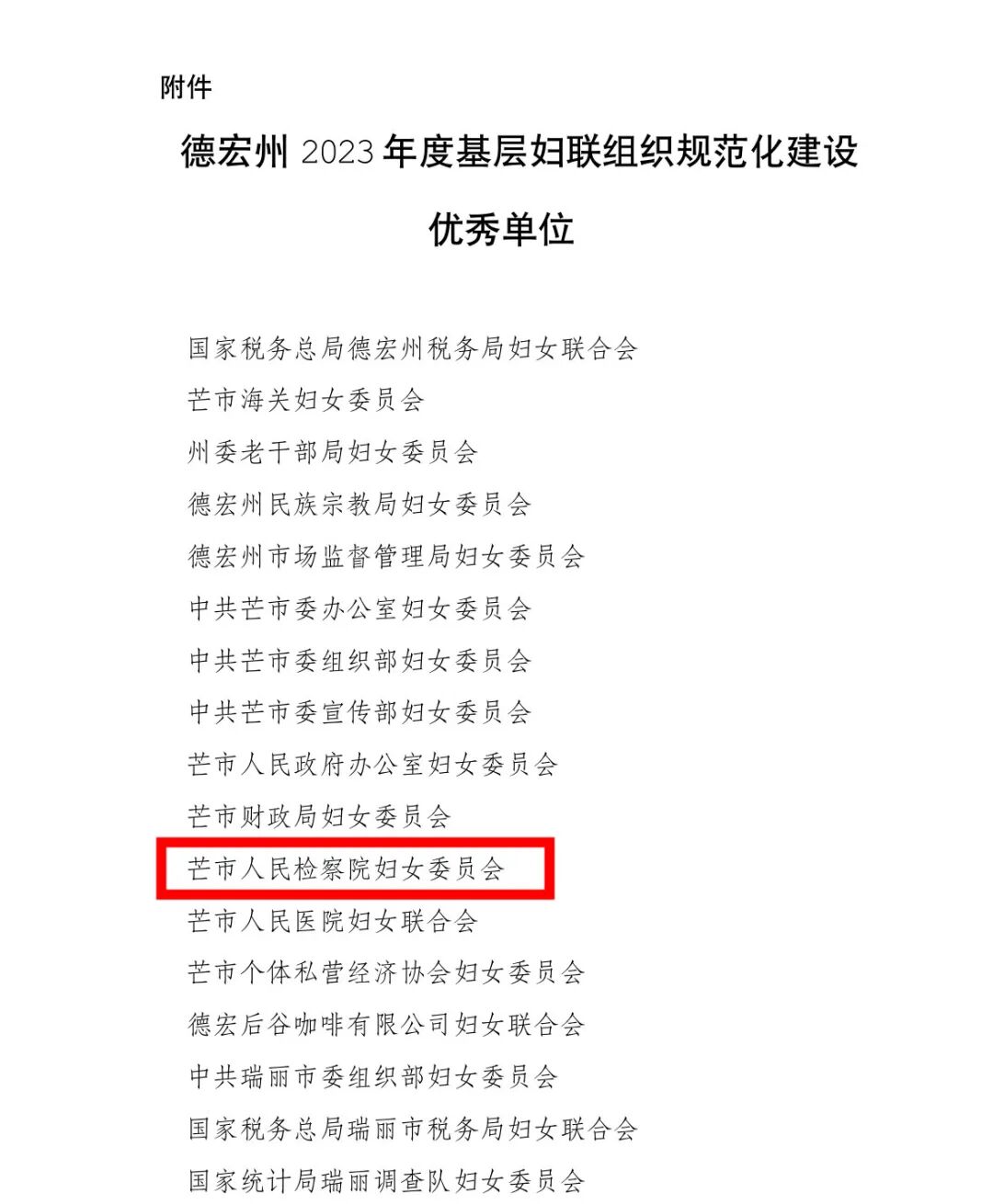 近日,德宏州妇联对2023年度基层组织规范化建设优秀单位进行通报表扬,芒市人民检察院妇女委员会获得“州基层妇联组织规范化建设优秀单位”称号!