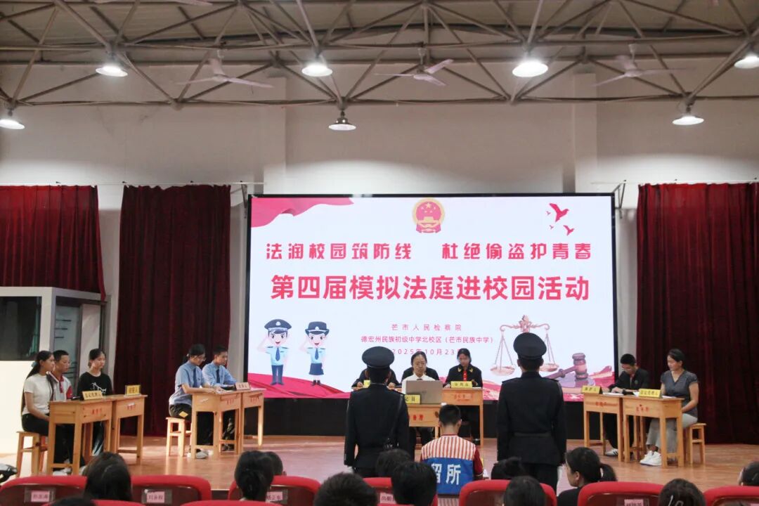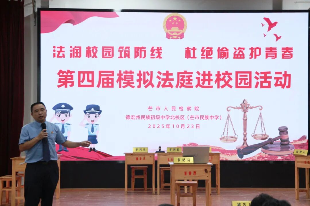 近日,芒市人民检察院走进芒市民族中学,创新开展“校园法治剧本杀+模拟法庭”普法宣传活动。通过角色扮演、情景模拟、互动问答等形式,将枯燥的法律条文转化为生动的“青春课堂”,300余名初中生在沉浸式体验中学习法律知识、增强法治观念。