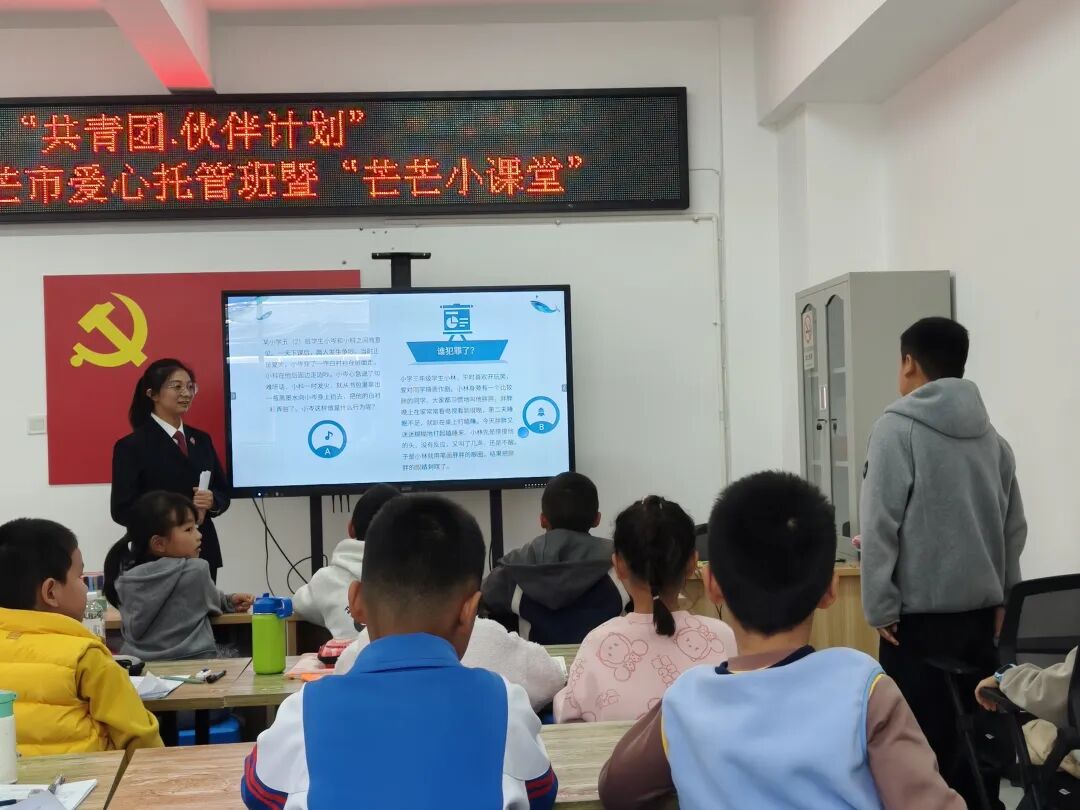 为切实做好未成年人法治教育和安全保护工作,筑牢青少年健康成长法治防线,2026年1月26日,芒市人民检察院干警走进滨河社区“共青团·伙伴计划”2026年寒假芒市爱心托管班暨“芒芒小课堂”,为孩子们带来一堂生动的预防违法犯罪、自我保护主题法治课。