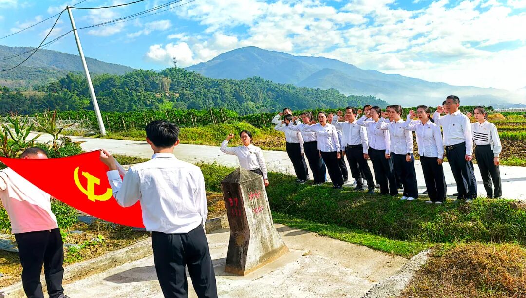 在97号界碑前,随着讲解员绘声绘色地讲述,徐徐展开了一幅厚重的历史文化画卷。全体党员面向党旗,神情庄重肃穆,重温入党誓词。激昂的誓言声声回荡,彰显着党员们对党的无限忠诚和对国家的深沉热爱,进一步激发了他们守护国土的坚定决心。