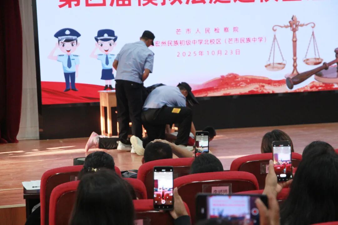 近日,芒市人民检察院走进芒市民族中学,创新开展“校园法治剧本杀+模拟法庭”普法宣传活动。通过角色扮演、情景模拟、互动问答等形式,将枯燥的法律条文转化为生动的“青春课堂”,300余名初中生在沉浸式体验中学习法律知识、增强法治观念。